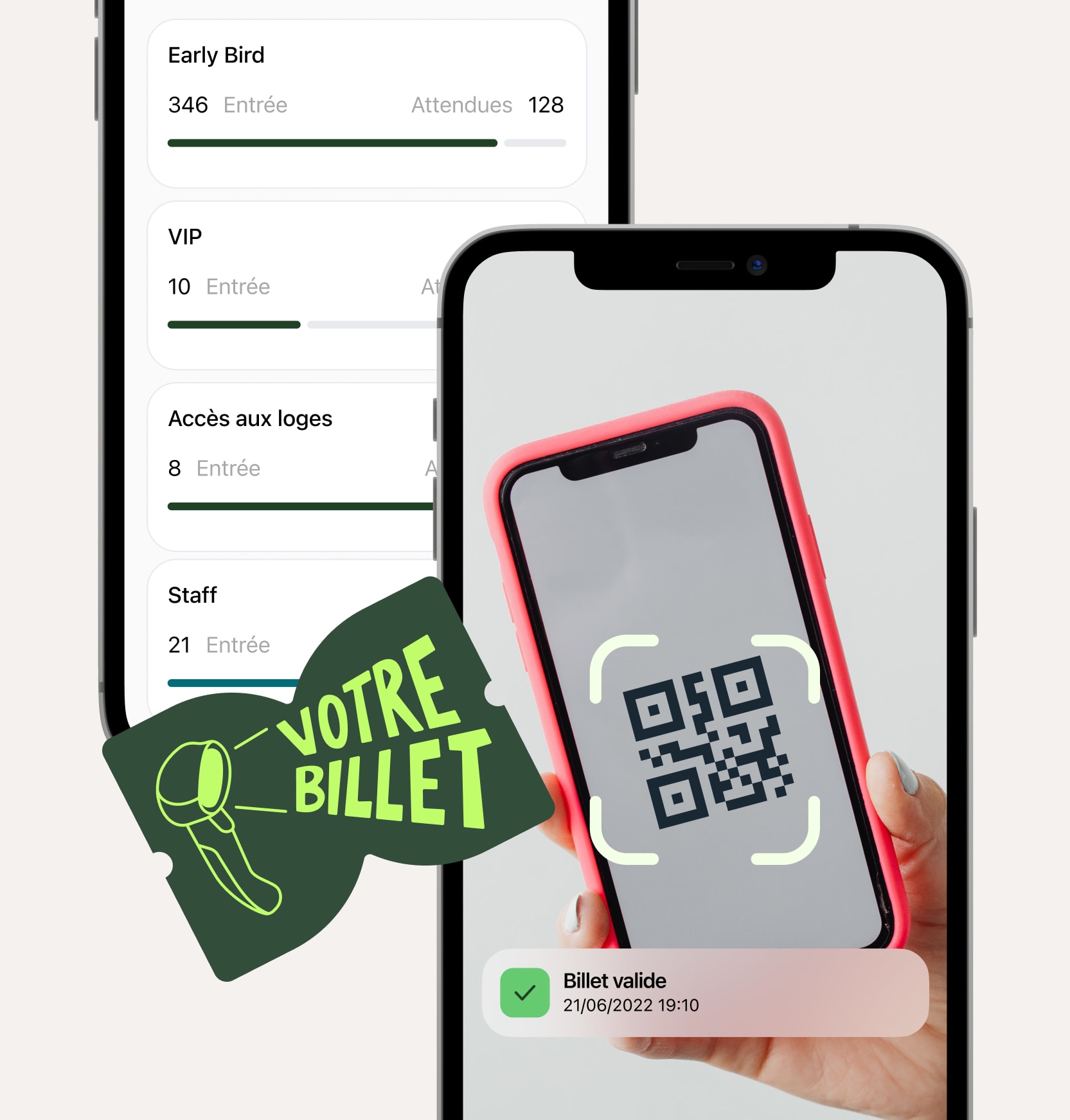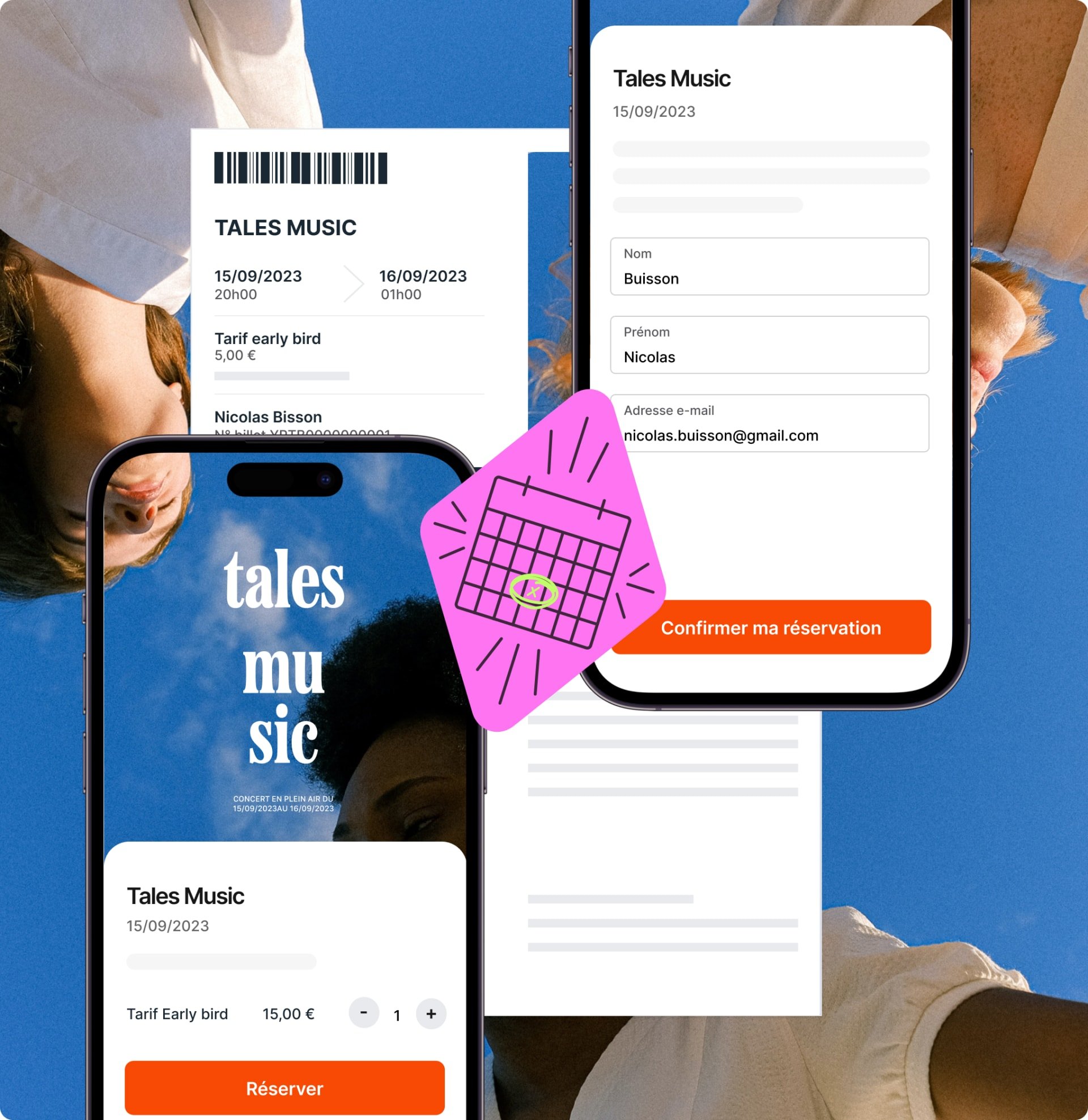 Illustration d'une billetterie en ligne sur mobile et d'un billet d'événements