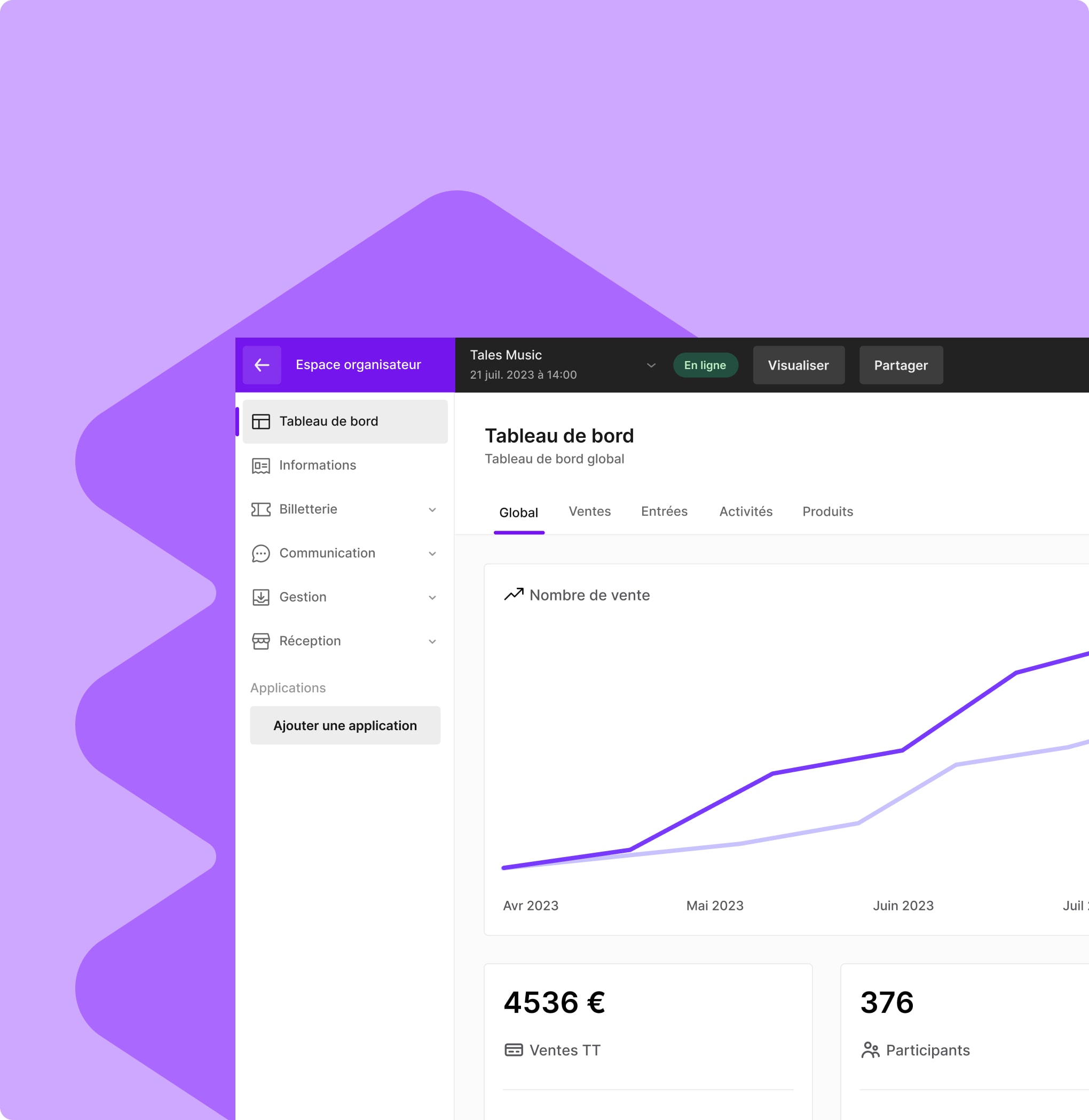 Notre service s'adapte à tout type d'organisateurs (de salon, festival, clubbing, concert, gala, sport, etc.) et à tous les formats d’événements (physique, virtuel, hybride).